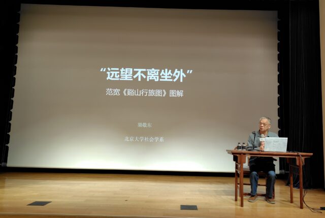 8日には、会場を塱頭村へ移し、祠堂建築と文化園の見学を経て、明代の大儒・陳白沙の読書所に由来する「春陽台」劇場にて、渠氏が講演を行った。「遠望不離坐外」という視点から、北宋山水画の名作・范寛《溪山行旅図》について極めて詳細な解説を試みた。西洋絵画とは異なり、中国絵画の構成と叙述は「気」(気運や気勢)の流動なしには語れず、それらのリズムのあわいに、人境・道境・神境が形づくられる。夕刻には唐寅などの作品をめぐって議論を行った。その後、張瑞図など重要作品の鑑賞も続けられた。